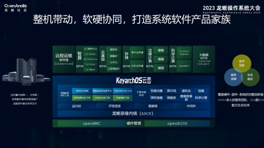 龙蜥社区已经快速成长为中国最具影响力的开源操作系统社区。浪潮信息在2022年加入龙蜥,在社区版本的基础上开发出了云峦KeyarchOS,主要面对数据中心里最核心的需求,在稳定可靠、软硬协同、智能运维、安全可信方面做了特性增强。浪潮信息是全球领先的算力提供商,合作伙伴基本上涵盖了全球多数的芯片厂商、板卡厂商,以及下游做数据库、中间件的厂商。借助这样的力量,过去十几年来不断推动云峦KeyarchOS和上下游厂商做认证,而且是真正意义上的双认证,目前在医疗、教育、通信、金融等等行业已经得到广泛应用。