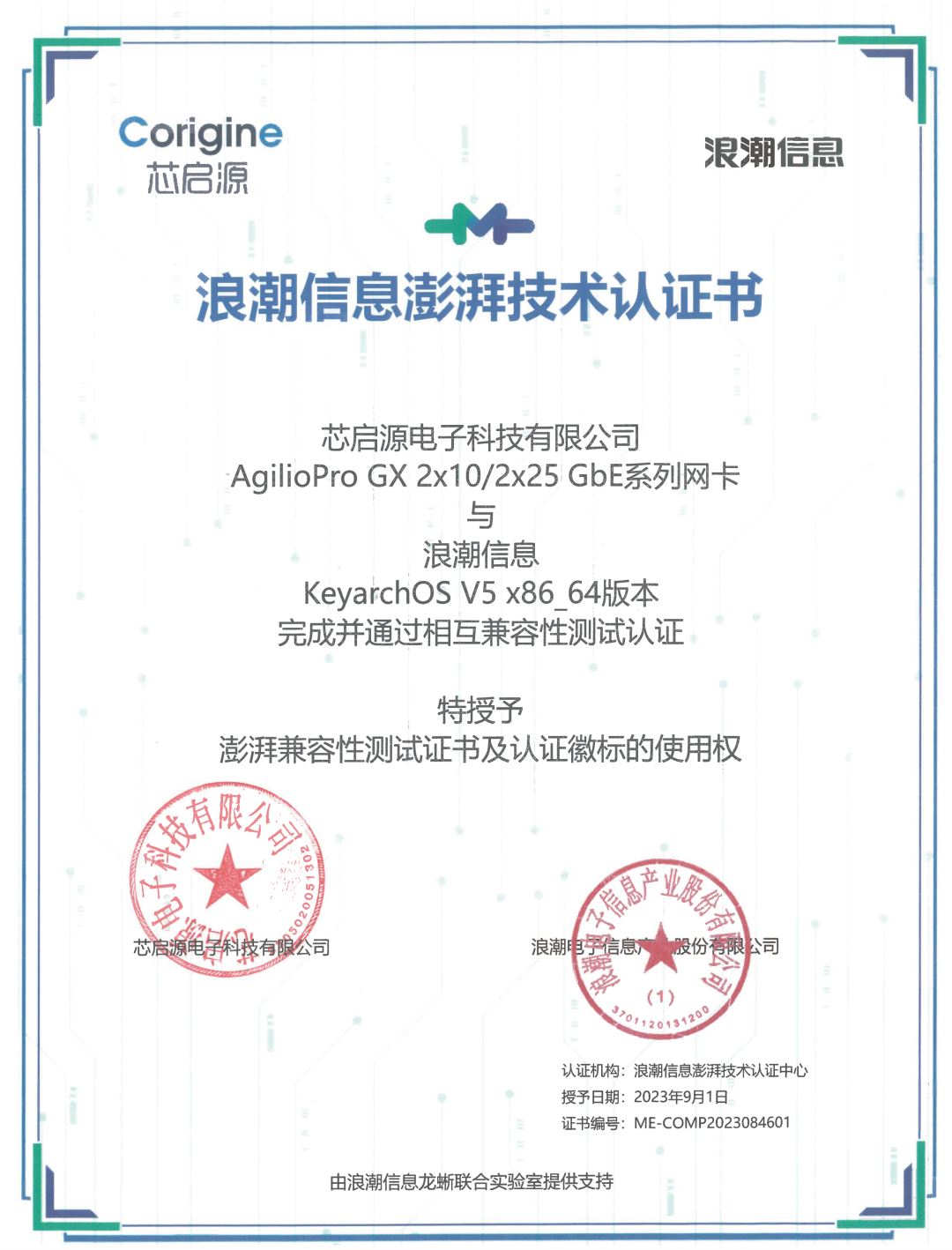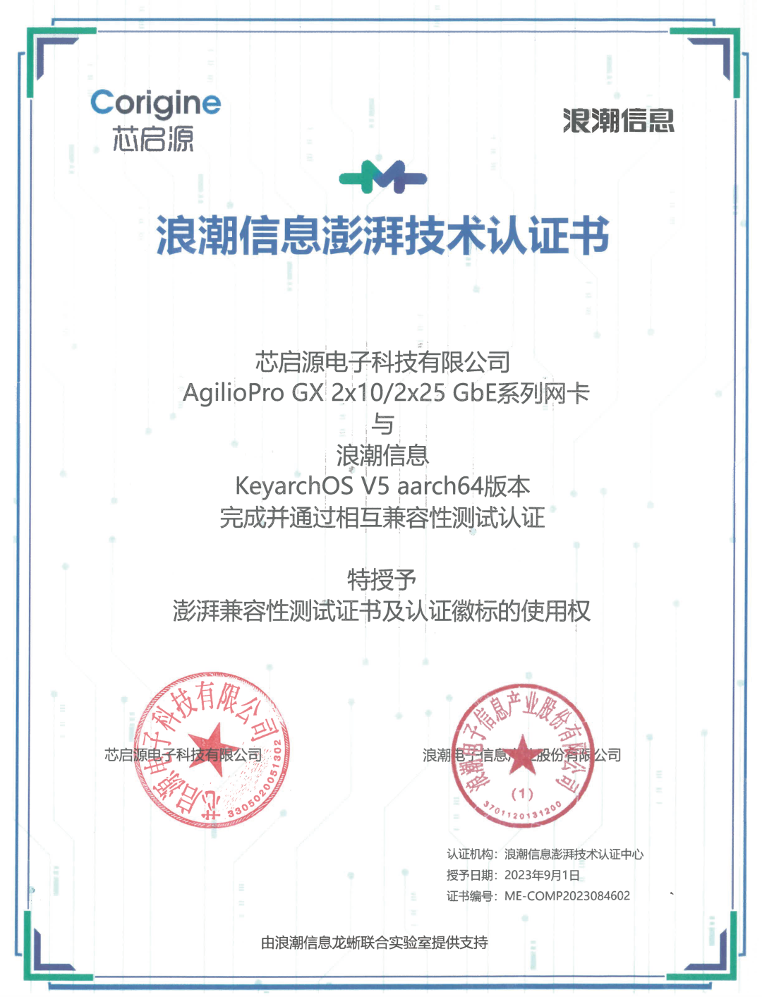 日前,芯启源DPU智能网卡与KeyarchOS完成并通过了浪潮信息澎湃技术认证,经双方联合测试,二者完全兼容,功能、性能和兼容性方面表现良好,运行稳定高效,满足用户需求。
