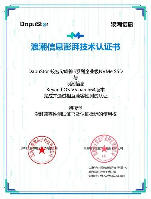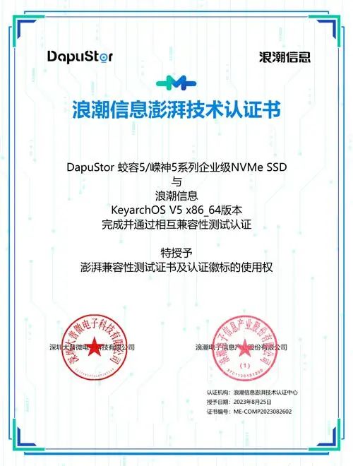 日前,大普微与KeyarchOS完成浪潮信息澎湃技术认证,测试结果表明,大普旗下DapuStor 蛟容5、嵘神5系列企业级NVMe SSD与浪潮信息云峦服务器操作系统keyarchOS满足兼容认证要求,整体运行稳定,在功能、性能及兼容性方面表现良好。