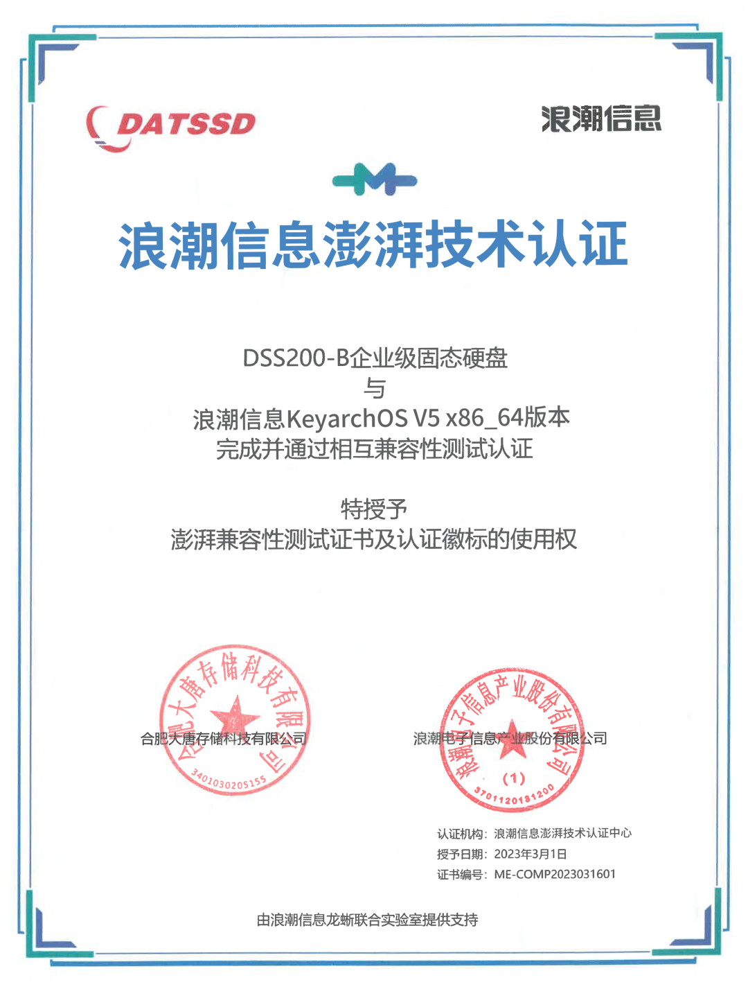 日前,合肥大唐存储DSS200企业级固态硬盘与浪潮信息云峦操作系统KeyarchOS(简称浪潮信息KOS)V5完成并通过了兼容性适配认证。测试结果显示,合肥大唐存储固态硬盘DSS200-B在x86_64版本、aarch64版本浪潮信息KOS上均能够稳定运行,在功能、性能和兼容性等各方面表现良好,满足用户对关键性功能的需求。