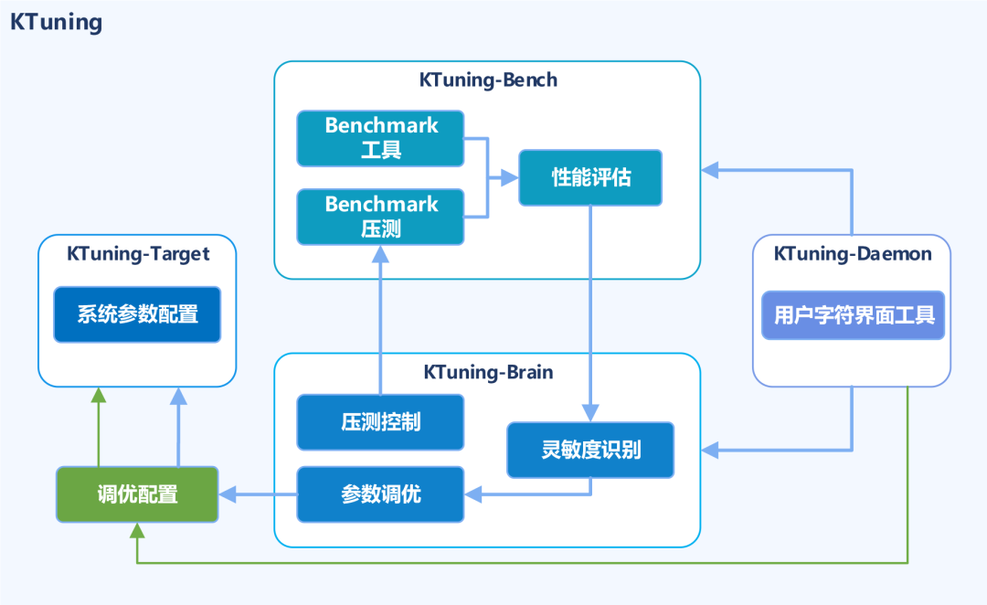 KTuning-Daemon:KTuning 的调度管理组件,包含 CLI 和 Daemon 两个部分。CLI 模块提供用户可用的命令行接口,命令分为基础命令、静态调优相关命令、动态调优相关命令三个部分。KTuning-Daemon 作为核心管控模块,负责监控其他组件、接收解析来自 CLI 的命令、按照业务处理顺序调度相关组件等