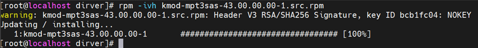 (2)执行 rpm -ivh kmod-mpt3sas-43.00.00.00-1.src.rpm命令解压驱动源码包;