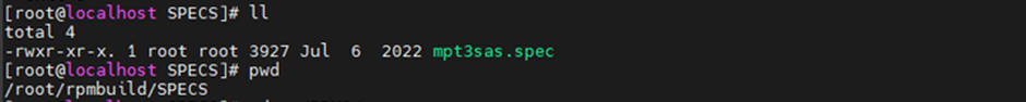 (3)进入到/root/rpmbuild/SPECS目录中,执行rpmbuild -bb mpt3sas.spec命令编译驱动rpm包;