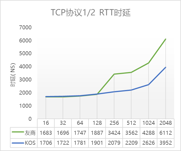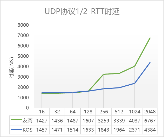 在相同的硬件环境下,使用Solarflare的SFNT测试工具对网络延迟性能进行测试,基于KeyarchOS V5.8的低延迟网络通信解决方案,网络性能测试效果比友商OS性能提升40%-50%。