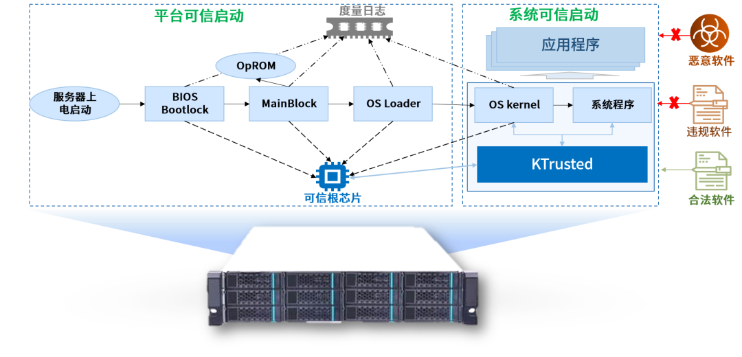 KTrusted采用基于硬件可信根的可信度量技术,构建从服务器上电到操作系统启动的信任链;同时提供基于可信状态的操作系统引导控制、操作系统可信启动控制、操作系统可信报告查询等功能。