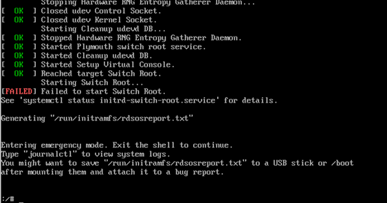 系统启动时进入紧急模式(emergency模式),打印Failed to start Switch Root报错,具体如下:
