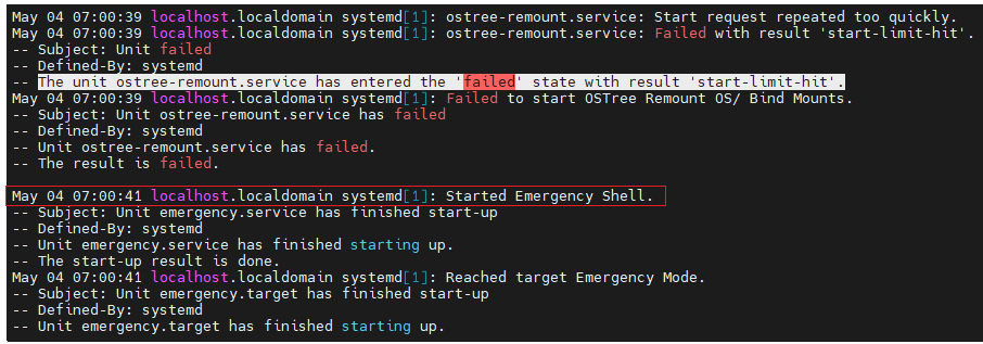 (1)系统日志提示,进入emergency模式前,存在ostree-remount.service服务启动失败的异常打印。