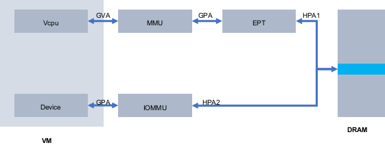 为了实现 HPA1 等于 HPA2,需要 GPA 到 HPA 的映射是固定的并进行 iommu 表的建立,vfio 是通过 VFIO_IOMMU_MAP_DMA 命令实现。