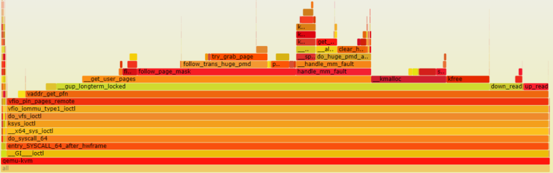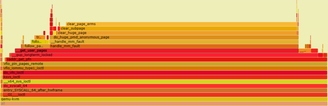 下图是一个虚拟机启动时的火焰图,这里的虚拟机启动是指 qemu 进程开始执行到虚拟机内部出现 BIOS 界面为止,不包括虚拟机内部的内核加载、服务运行过程,从火焰图可以看到最耗时的函数是 clear_subpage 函数,根据函数调用关系可以看到是从 qemu 端调用了 ioctl 系统调用,这里就是要将虚拟机内存大小的虚拟内存执行 iommu 映射工作,将虚拟地址映射到指定的物理地址上。这其中就需要先将虚拟地址执行 page fault,并将虚拟机地址和物理地址的关系固定下来,再执行 iommu 映射操作。