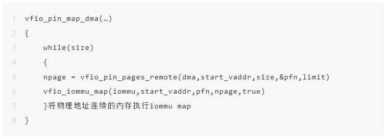 IOMMU_MAP_DMA 的 ioctl 进入内核空间会执行到 vfio_pin_map_dma 函数,在这个函数里会对虚拟机内存大小的虚拟内存进行 iommu map 操作,首先调用 vfio_pin_pages_remote 进行内存 pin 操作,这个函数的返回值 npage 是物理地址连续的N个内存页,然后调用 vfio_iommu_map 执行 iommu map 操作,比如对于 500G 内存的虚拟机来说会执行很多次这两个函数。