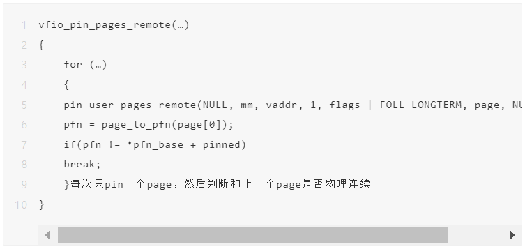 vfio_pin_pages_remote 这个函数会返回物理连续的多个内存页,为了实现这功能,每次调用 pin_user_pages_remote 获取一个页,然后判断和上一个页是否物理连续。