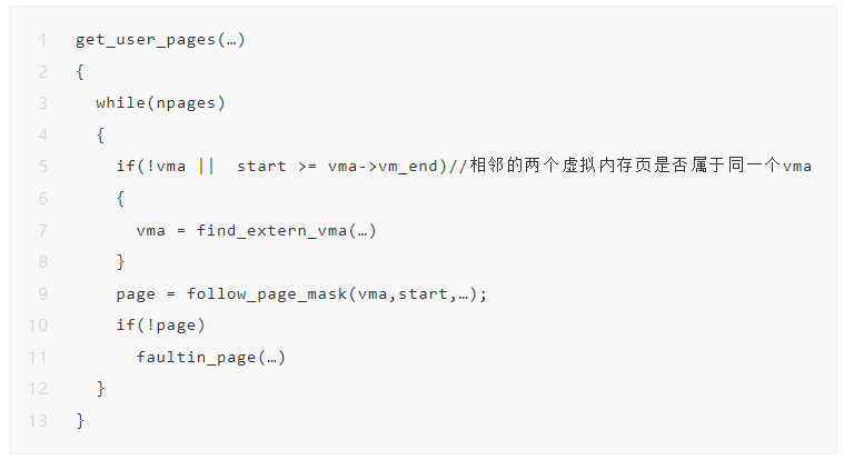 前面说的 pin_user_pages_remote 函数执行了很多次,这个函数里主要是调用了 get_user_pages,根据需要 pin 的 page 个数,首先判断相邻的两个虚拟内存页是否属于同一个 vma,如果不是则调用 find_extern_vma 函数获取 vma,这个函数从火焰图来看也是耗时比较长的,下面就是执行 follow_page_mask 获取页表,如果还未分配物理页则调用 page fault。