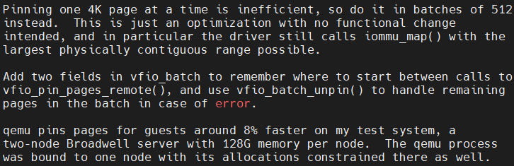 下面看一下内核社区的优化方案,5.12 内核合入主线,通过修改 vfio 代码实现,commit 说明有 8% 的性能提升。