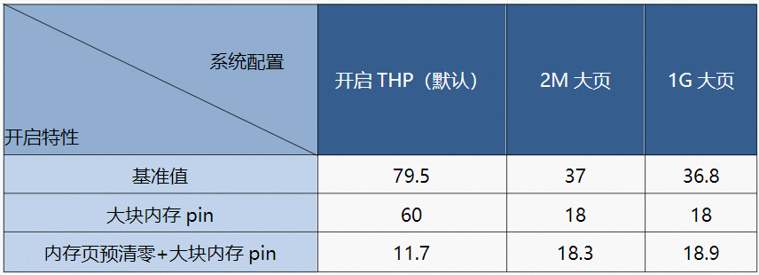 最终的测试结果:默认情况下(即开启透明大页),如果只开启大块内存 pin,启动时间从 80 秒降低至 60 秒,如果再开启内存页预清零,启动时间将降低至12 秒。再看下虚拟机内存使用大页内存的情况下的测试结果,在使用 2M 或 1G 大页时开启大块内存 pin 功能时,虚拟机的启动时间基本从 36 秒降低至 18 秒,就算在开启内存页预清零,启动时间也没有变化,因为内存预清零不能作用于标准大页。