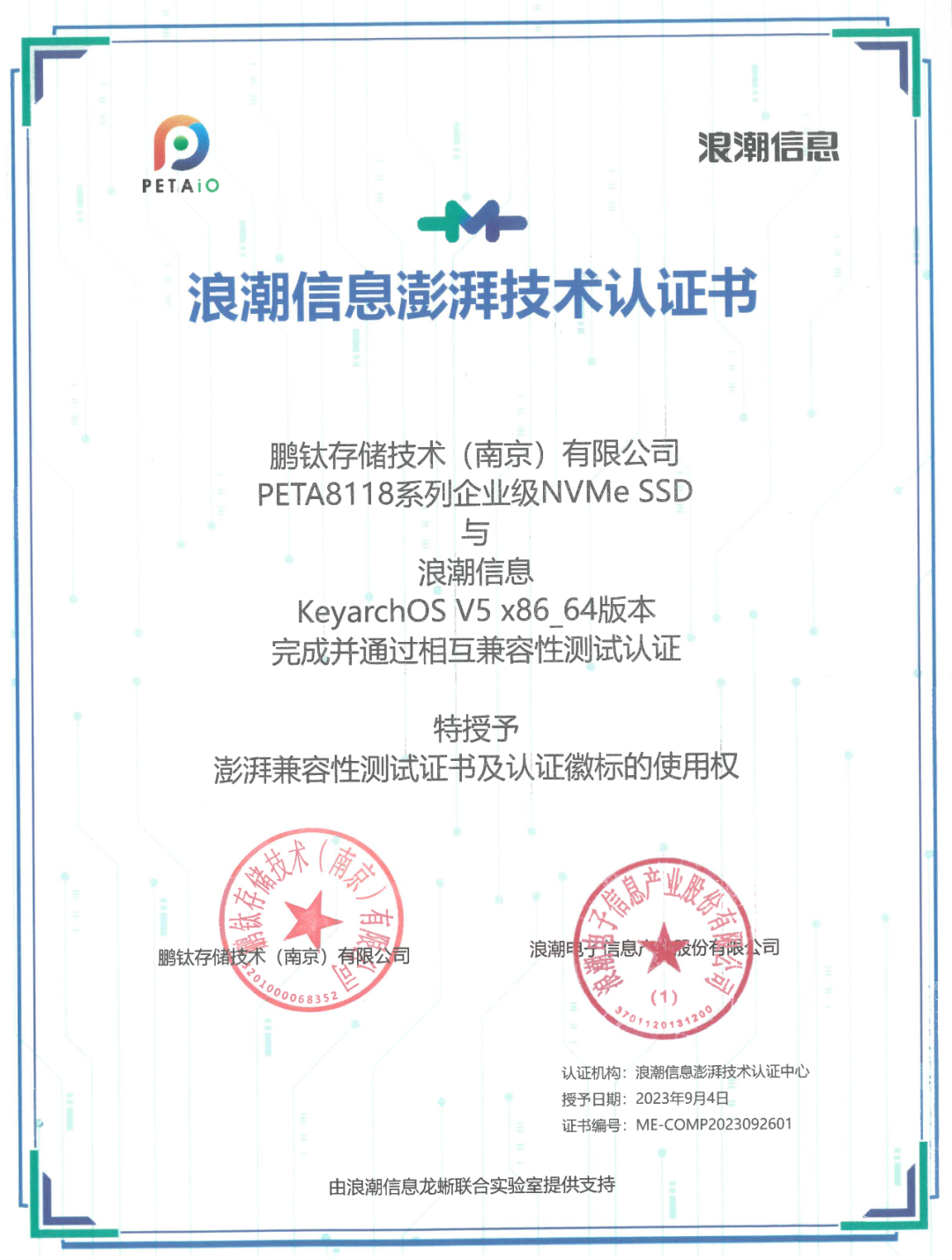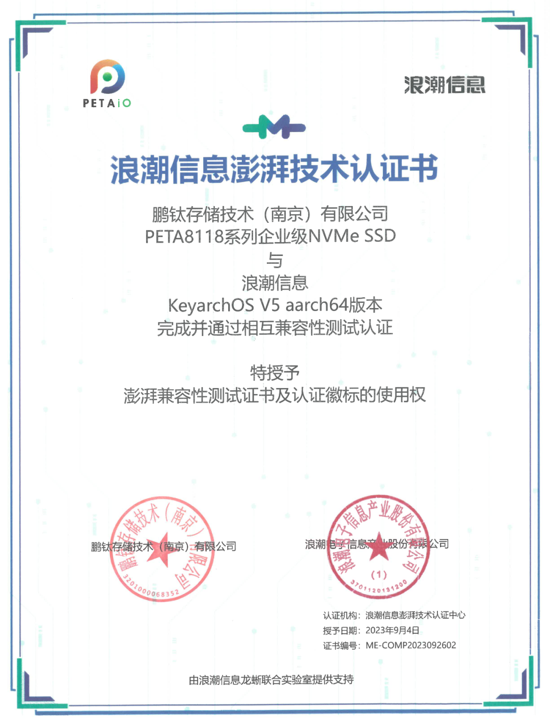 近日,鹏钛存储技术(南京)有限公司(简称“鹏钛存储)PETA8118系列企业级NVMe SSD与云峦操作系统KeyarchOS V5完成浪潮信息澎湃技术认证。经双方联合测试, 双方产品功能兼容性良好,整体运行流畅,性能表现优异,满足用户需求。