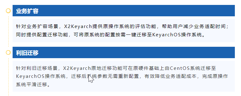 X2Keyarch是一款可视化迁移工具,基于龙蜥开源项目SysOM迁移模块研制,提供CentOS系统到KeyarchOS的迁移功能。该工具提供迁移风险评估、系统配置评估、配置迁移等功能,其原地迁移技术可将存量CentOS系统批量迁移至KeyarchOS操作系统,迁移后系统参数无需重新配置,可以提高迁移效率,降低客户迁移成本。
