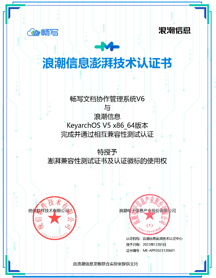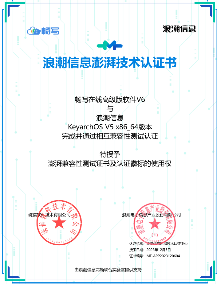 日前,统信畅写文档协作管理系统和畅写在线各版本软件与云峦操作系统KeyarchOS V5完成浪潮信息澎湃技术认证。经测试,双方产品整体运行稳定,在功能、性能及兼容性方面表现良好,满足客户的核心需求。