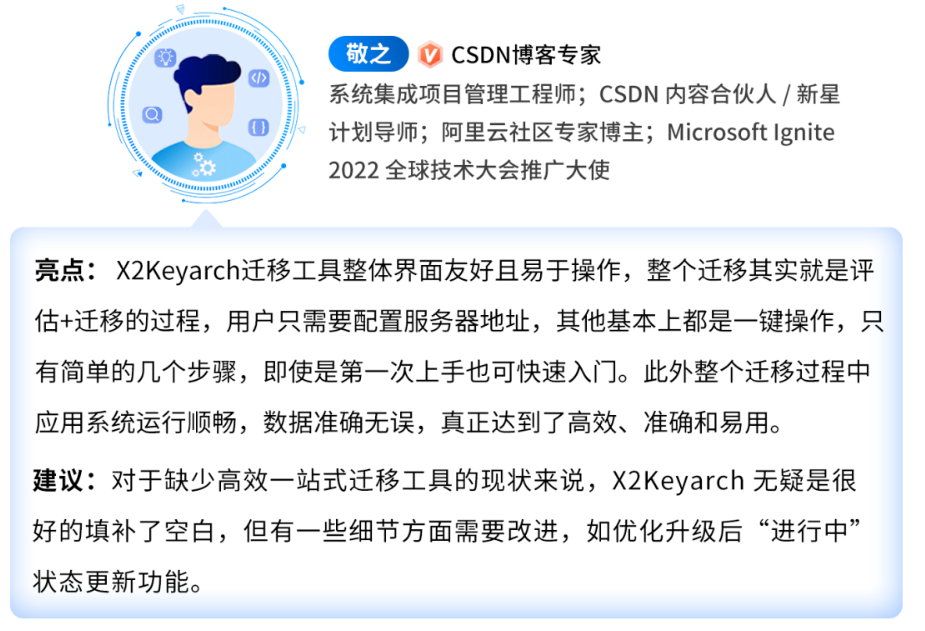 总体上来说浪潮信息 X2Keyarch 迁移工具是一款非常优秀的迁移工具,对于缺少高效一站式迁移工具的现状来说,X2Keyarch 无疑是很好的填补了这个空白。虽然还有一些细节方面需要改进,但是整体上我对此次使用非常满意。