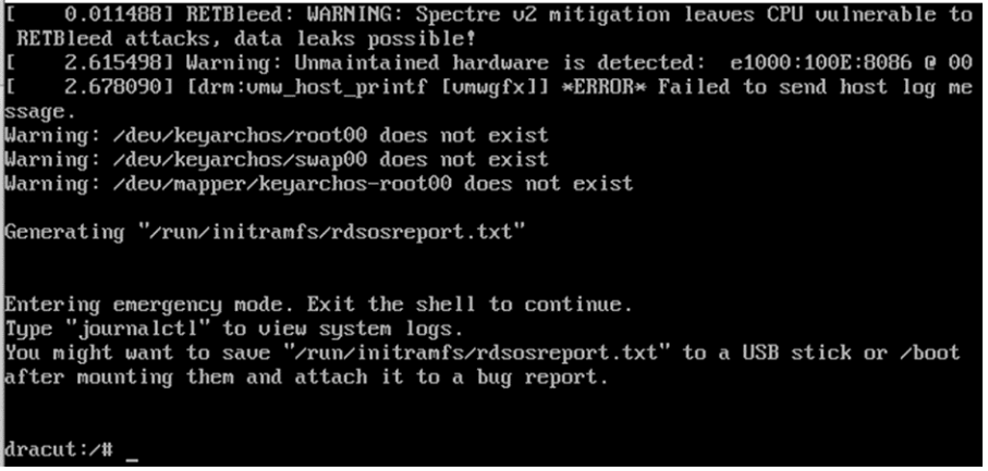 系统启动时进入紧急模式(emergency模式),打印/dev/keyarchos/root00 does not exist报错,具体如下: