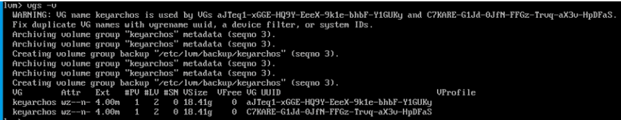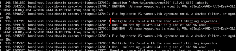 从日志中看,系统进入emergency模式的原因是:系统中存在多个VG,并且VG Name是相同的keyarchos 。