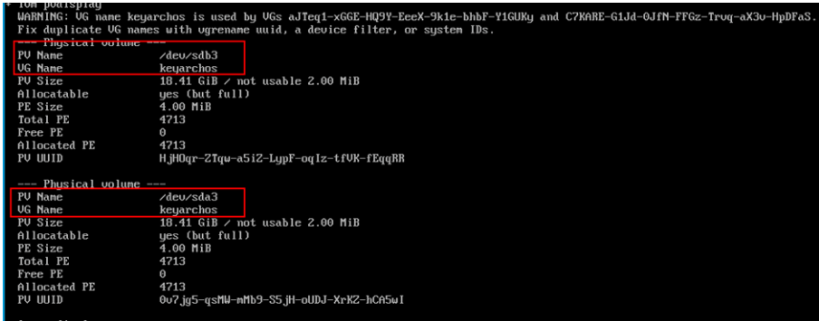 服务器中存在两块磁盘,且有相同的VG Name,造成系统启动时无法确认加载哪块磁盘中的操作系统。