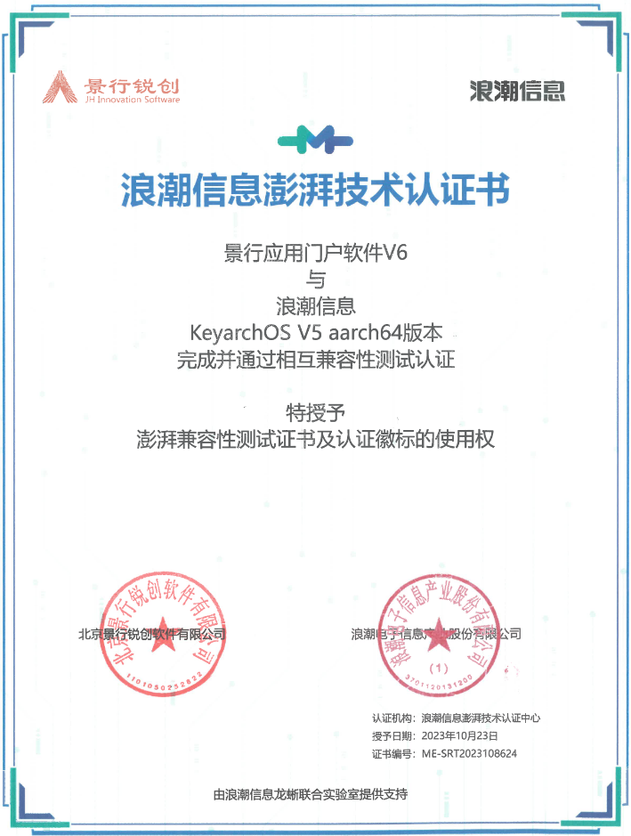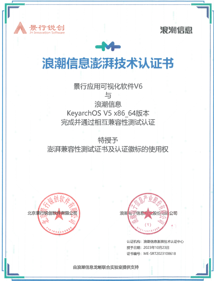 日前,北京景行锐创软件有限公司(简称景行锐创)与KeyarchOS通过浪潮信息澎湃技术认证,双方兼容性测试,景行安全控制软件V6、景行应用可视化软件V6、景行应用门户软件V6、景行资源分析软件V6、景行资源管理与调度软件V6在KeyarchOS V5平台上运行稳定高效,整体表现良好,满足用户需求。