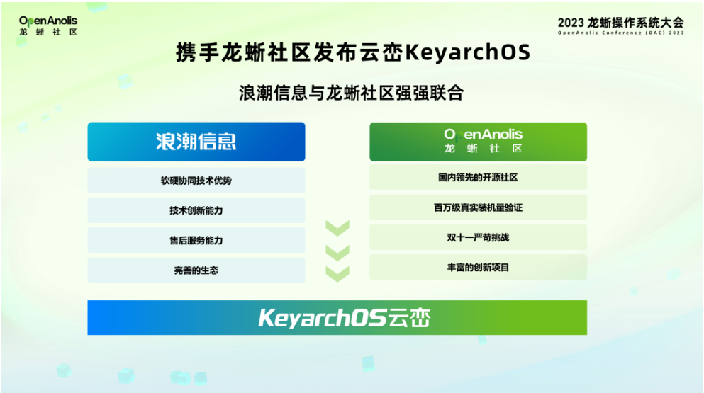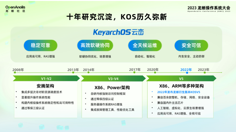 2022 年,浪潮信息联合龙蜥社区正式推出了服务器操作系统商业发行版云峦 KOS。从 2008、2009 年开始,KOS 主要用于内部支撑,2022 年我们面向通用市场正式推出了商业发行版。在小机方面的研究经验,覆盖全球的售后服务能力,以及依托整机所积累的二三十年的生态,是浪潮信息做操作系统的核心优势。从整个运行体制和运营机制上来讲,龙蜥社区是一个非常开放中立的社区,这是我们选择龙蜥操作系统开发商业发行版的重要考虑因素。龙蜥社区理事长单位阿里云是典型的应用厂商,其应用品类可能是最多的,这符合我们“以应用为导向”的技术理念。龙蜥操作系统经历了“双 11”等极端考验,因此我们对龙蜥操作系统有充分的技术信心,联合社区推出了商业发行版。