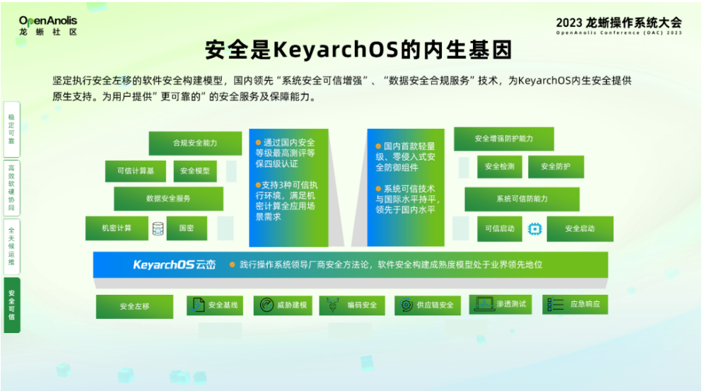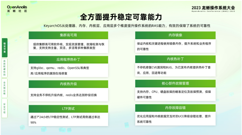 在稳定可靠方面,操作系统很难看到大的技术迭代和革命性更新,但在优化方面有很多工作要做,或许一个点优化完之后,可以让业务系统每年少宕机一些时间。在 Servers 可维护性方面,KOS 具备内核热补丁、内核热升级等能力,在尽量少影响业务的情况下,实现系统的持续稳定迭代。如果内核升级时需要重启系统,肯定会造成业务中断,且影响时间比较长。在内核热升级基础之上不停机,redis 业务基本呈现出秒级切换。我们做过统计,在服务器的故障场景中,内存故障占到所有故障场景的 80%。在全国芯片市场体系下,可能故障率会更高。在庞大的、几十万条经验库的支撑下,通过内存故障预测、内存故障容错等提升操作系统的稳定可靠属性,LTP 测试用例通过率达到了 98%,在业界具有非常高的水准。