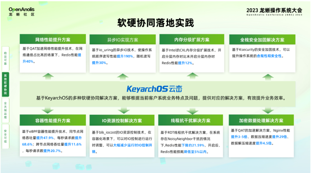 在软硬协同方面 KOS 也有相应优势。KOS 非常关注硬件方面能力,希望把算力充分发挥出来。浪潮信息与 Intel 合作,用最新的 QAT 技术提升整个传输性能,在网络通信占比高的场景下 Redis 性能提升了 40%。异步 IO 可以提升操作系统的读写性能,来源于社区的创新技术在产品中使能,包括 CXL 内存分层优化、安全加固,这是安全方面的特性。性能提升eBPF也是当前非常热门的技术点,我们联合龙蜥社区发布了《eBPF 技术实践白皮书》(关注龙蜥公众号【OpenAnolis龙蜥,后台回复关键字“白皮书”即可获取下载链接】)。eBPF 目前是操作系统领域相对比较新、比较热门的点,它可以在网络、安全、可观测性方面全面增强对于操作系统的使用能力。