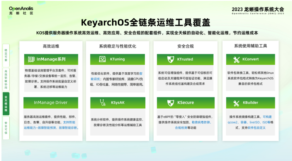 使用操作系统还需要搭配一些工具,否则纯命令行很难将操作系统用好。KOS 在运维工具开发方面进行了全面的布局,在运维方面,浪潮信息本身具有 InManage 服务器管理套件,其包含了很多工具。这一服务器管理套件在单一集群中可以管理 10 万节点,累计管理超过 400 万节点,这是在金融领域中最大的一个管理软件,也是 KOS 构建工具能力的核心。在稳定性和性能优化方面,KOS 利用 Ktuning 实现数智化调优,利用 KSysAK 实现故障快速定位,这两个软件也给到内部的云、数、存储产品线,获得一致好评。安全可信方面,后面将专门介绍无侵入病毒检测等相关工作。