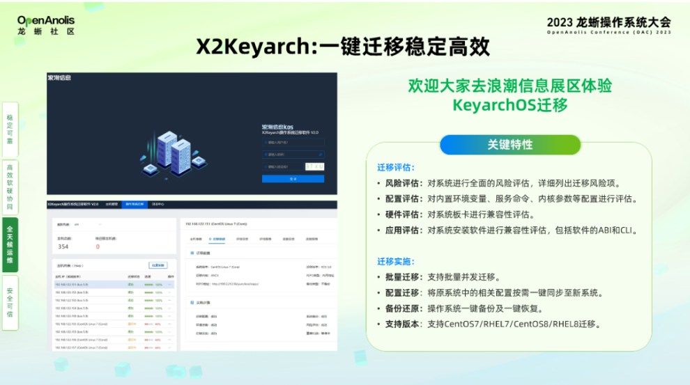 在《国产服务器操作系统发展报告(2023)》中,根据信通院面向用户群体的调研显示,龙蜥操作系统位列用户意愿迁移系统的首位。KOS 基于龙蜥操作系统增加了新的特性,构建了 X2Keyarch 迁移工具,高效支撑 CentOS 迁移。当前,我们也邀请了很多中立的开发者体验迁移能力,将镜像、环境提供给开发者,他们基于真实的应用进行迁移体验,并形成一些感受和建议。我们将开发者所写的技术文章,原汁原味地形成了《开发者说案例手册》,让更多的人了解迁移工具是不是好用,是不是足够兼容,是否足够支撑业务稳定运行。
