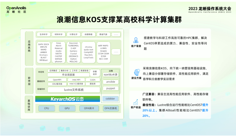 首先是教育领域的案例。KOS 支撑了某高校的科学计算集群,目前已经有 600 节点。在整个过程中,操作系统替换只是第一步。在此基础上,我们联合科学计算团队,进行了整体调优,从框架层到编译库层进行全方位的性能升级。优化升级后,整体超算性能比原来的 CentOS 提升了 20% 以上。