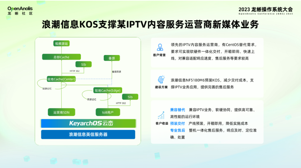 上图是广电行业案例。预装后不用担心兼容性问题,是这一案例中最吸引用户的点。原先运行在 CentOS 上的应用无缝切换到 KOS 上,展现出天生良好的兼容性。