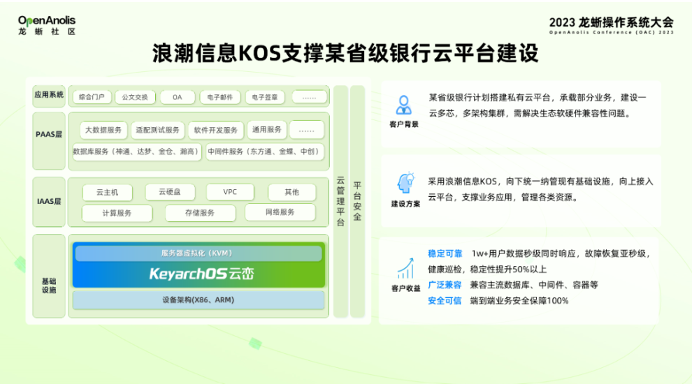 这是金融领域的案例。依托云平台,KOS 稳定支撑了省级银行的业务执行,经过操作系统、虚拟化与上层的云平台联合调优后,整体稳定性提升了 50% 以上。