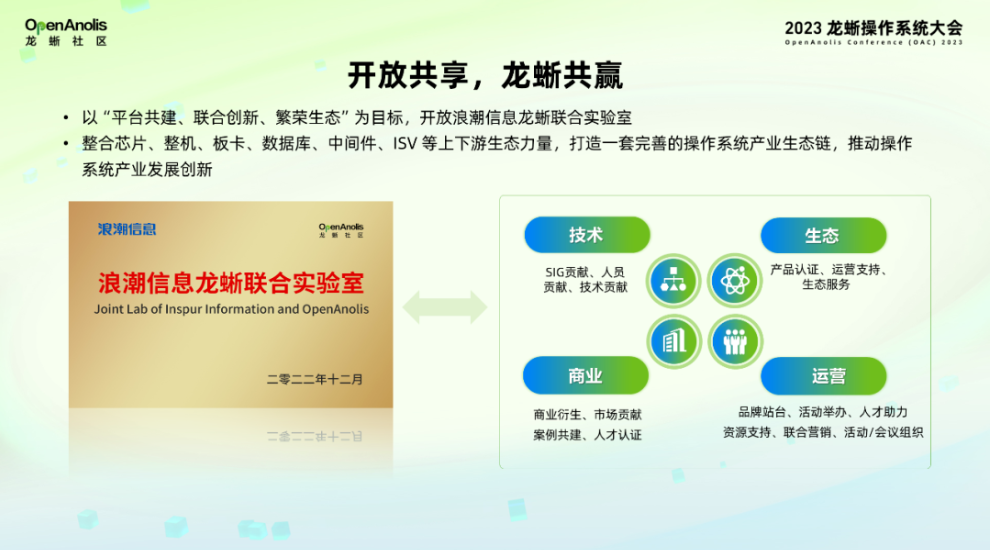 面向 2024 年,浪潮信息将依托联合实验室,在技术、生态、商业、运营等方面全面投入龙蜥社区的建设,推动国内操作系统产业发展创新。