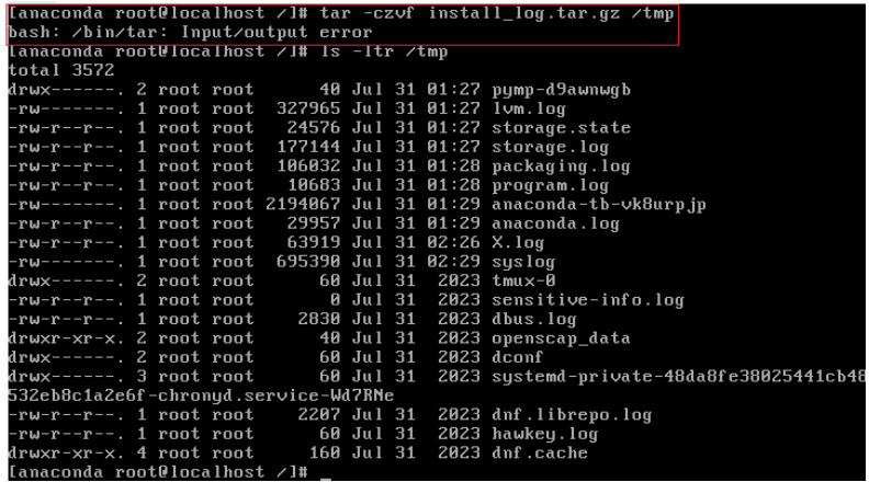(1)在系统安装过程中遇到这类问题,一般可以尝试按Ctrl+Alt+F2的方式,切换到文本控制台界面,查看或打包取出 /tmp 目录下的日志文件,检查有什么报错日志;在尝试打包系统安装日志/tmp目录时,发现tar命令使用报输入输出错误: