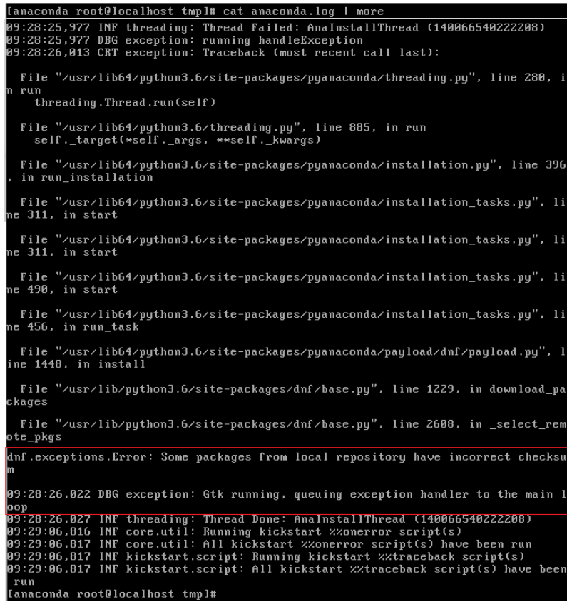 (2)所幸查看文件的命令cat 及 vi还可以正常使用,检查anaconda.log,发现存在报错Trace日志,报错原因是部分packages包存在错误的checksum值,导致系统安装过程异常: