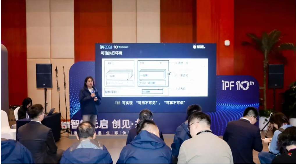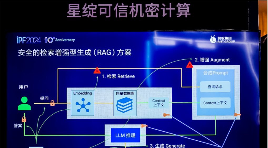 本次大会特设应用创新馆,面向科学探索、商业发展、自动驾驶、数字孪生、元宇宙、精准医疗等领域,展示人工智能技术驱动下的千行百业的智能化应用。KOS生态伙伴蚂蚁集团受邀亮相,展示基于星绽可信机密计算的全栈机密计算解决方案,方案结合区块链、大数据、大模型等热门技术,广泛应用在政务、金融、大数据交易、医疗等对数据要素安全流通、释放数据价值有需求的诸多场景。此外,蚂蚁集团高级技术专家段然发表了《蚂蚁大模型隐私保护最佳实践》主题分享,与现场观众进行了深入的交流。