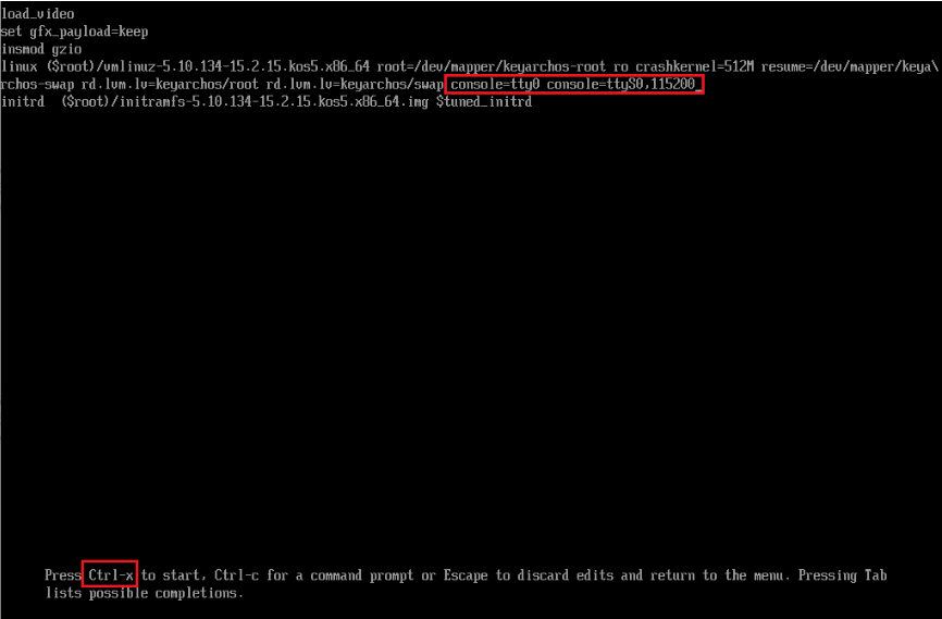 console=tty0 console=ttyS0,115200,随后按Ctrl+x启动: