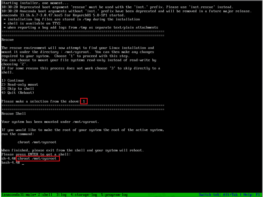 c. 在弹出的选项中,选择“1”,并输入“chroot /mnt/sysroot”挂载系统分区