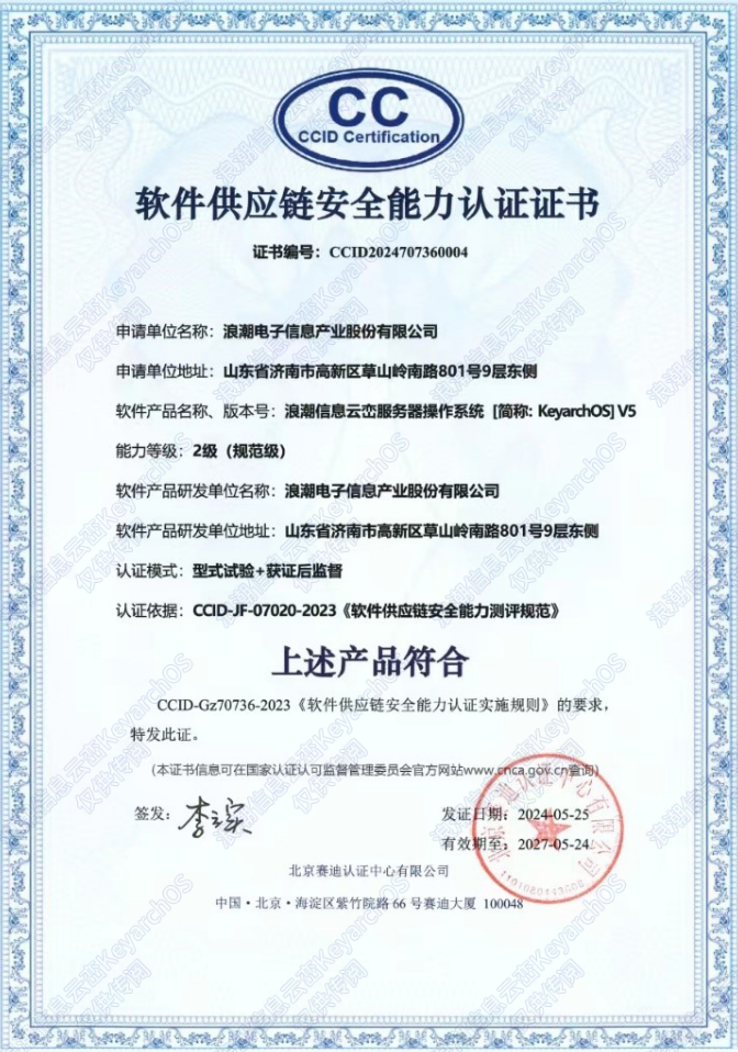 近日,《网络安全技术 软件供应链安全要求》(GB/T 43698-2024)国家标准正式发布,并将于2024年11月1日正式实施。5月30日,中国软件评测中心公布了首批通过软件供应链安全能力评估的产品,浪潮信息服务器操作系统云峦KeyarchOS(简称KOS),凭借在组织制度、机构及人员管理、软件开发交付等方面的严格把控成功入选,在目前操作系统业内位列最高等级,验证了浪潮信息在操作系统方面构建了极具韧性的供应链体系。