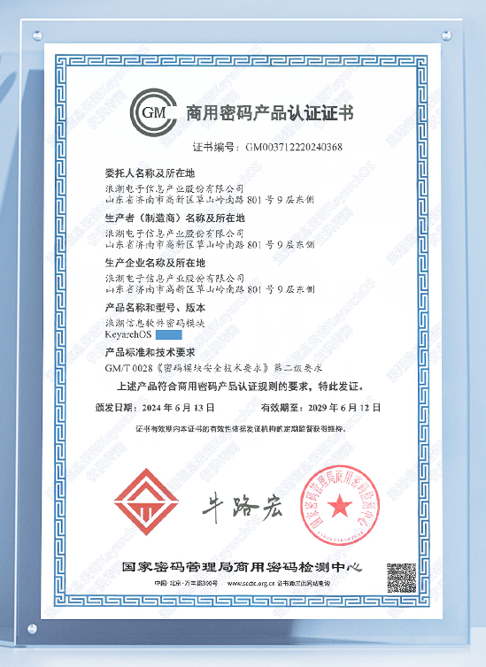 近日,浪潮信息服务器操作系统云峦KeyarchOS(简称KOS)软件密码模块通过国家密码管理局商用密码检测中心安全性审查,达到《密码模块安全技术要求》第二级要求,获颁《商用密码产品认证证书》。
