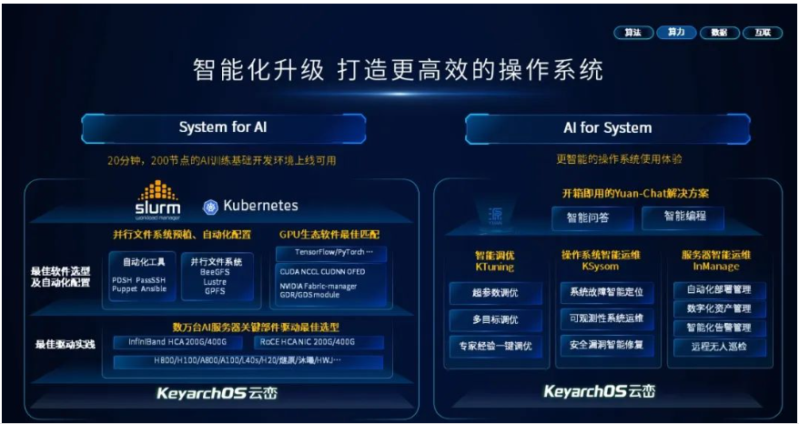 智能化升级方面,KOS新版本实现AI开发环境快速上线,包括为GPU、HCA卡等AI服务器关键部件驱动及CUDA/NCCL等GPU生态软件提供了最佳版本选型,预植lustre/BeeGFS等并行文件系统,并通过自动化工具快速配置AI开发环境,可在20分钟完成200节点的AI训练基础开发环境上线可用;AI for System方面,新版本融入开箱即用的Yuan-Chat解决方案,具备智能问答、智能编程能力,并且集成服务器智能运维、操作系统智能运维、智能调优组件,实现了系统故障智能定位、自动化部署管理、专家经验一键调优等更智能的操作系统使用体验。