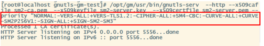 1)启动gnutls-serv程序,监听TLS访问请求,并指定使用国密证书(包括CA证书sm2-ca.pem,服务端证书sm2-server.key、sm2-server.pem)和国密加密套件。
