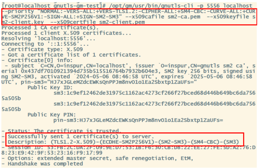 2)启动gnutls-cli程序,对gnutls-serv发起连接请求,并指定使用的国密证书(包括CA证书sm2-ca.pem,客户端证书sm2-client.key、sm2-client.pem)和国密加密套件,gnutls-cli与gnutls-serv使用国密算法完成三次握手,建立链接。