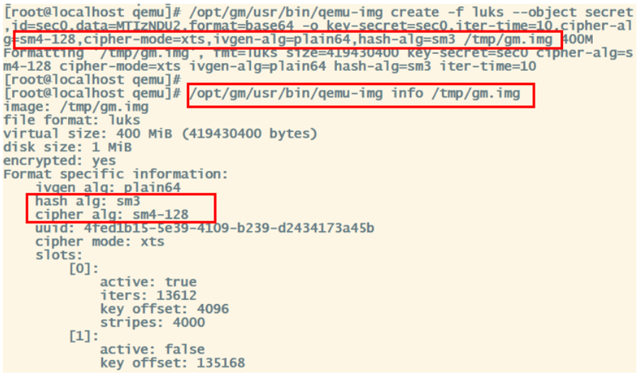1)qemu-img创建加密磁盘镜像gm.img,对称加密算法为SM4,散列算法为SM3。并使用qemu-img info命令查看磁盘镜像信息
