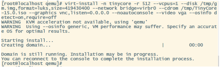 2)使用virt-install创建虚拟机,磁盘镜像使用gm.img,虚拟机创建成功