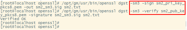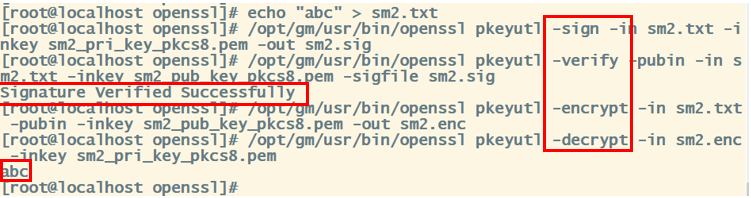 3)使用OpenSSL和生成的SM2非对称算法密钥对文件进行签名验签及加解密验证