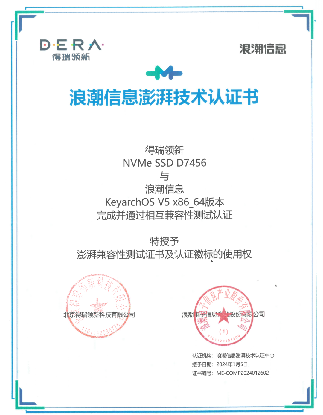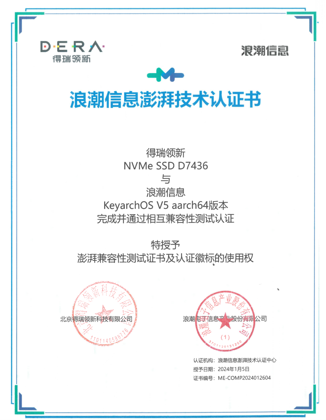 日前,北京得瑞领新科技有限公司(简称DERA)NVMe SSD D7436/ D7456与云峦服务器操作系统KeyarchOS完成浪潮信息澎湃技术认证,经过对产品功能、性能、兼容性适配的测试,双方产品完全兼容,整体运行稳定高效,满足用户的关键性应用需求。
