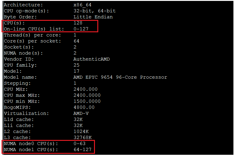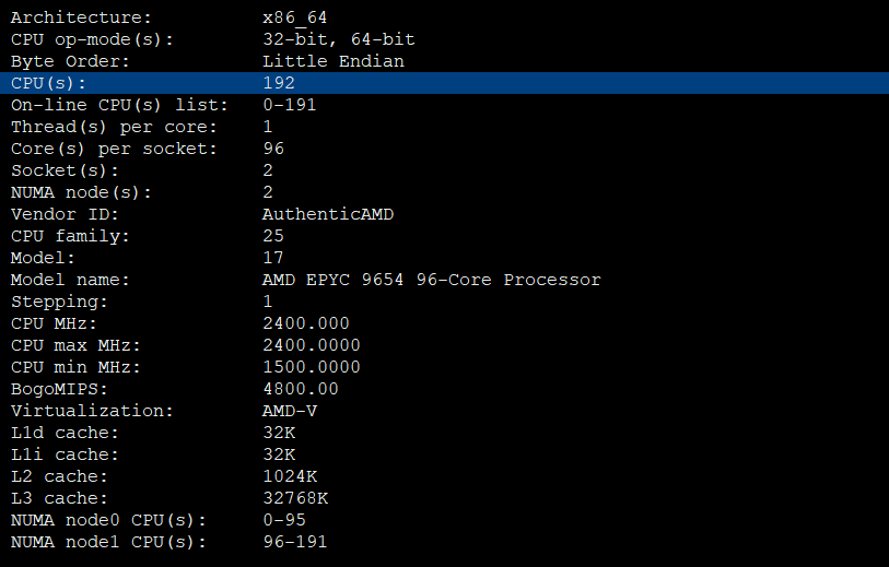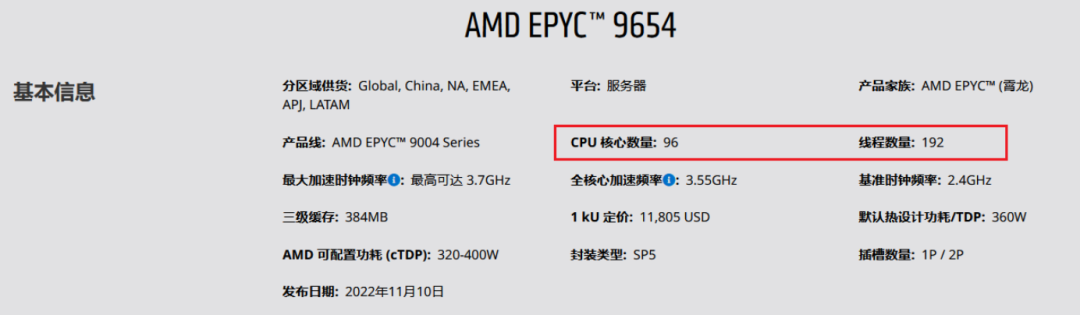 服务器中配置了2颗AMD EPYC 9654 处理器,从AMD官网查看单颗处理器核心数量为96,那么配置2颗CPU,在系统下查看CPU核心数量应为192。